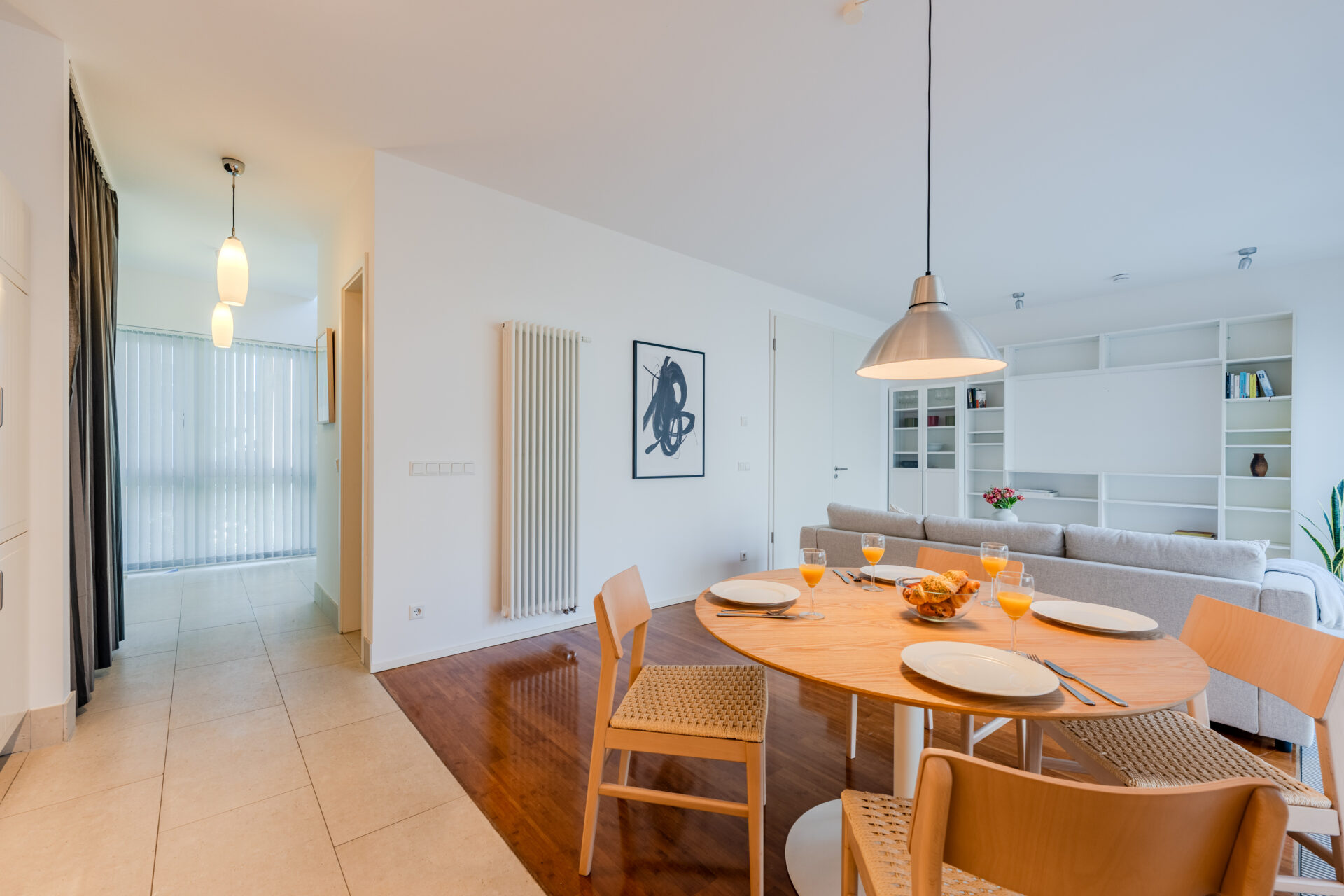 Spread over two thoughtfully designed levels, this stunning maisonette apartment is filled with natural light, thanks to its beautiful floor-to-ceiling windows in every room. On the lower level, you’re welcomed into a spacious entrance area, where the staircase leads to the upper floor. The open-plan living and kitchen area is perfect for both relaxing and entertaining. The modern kitchen is fully equipped with high-quality appliances, including an oven, induction stove, microwave, and large refrigerator. A dining table comfortably seats four, and the adjacent living area features a cozy sofa and smart TV—ideal for unwinding at the end of the day. The view into the landscaped garden adds to the serene atmosphere. Also on the lower level is a versatile bedroom, which includes a single bed, large wardrobe, and desk. It’s perfect for guests, children, or as a dedicated home office. The room is also completely soundproofed, ensuring a quiet and peaceful environment for work or rest. A modern bathroom with a shower completes the ground floor. Upstairs, you’ll find a bright and airy hallway leading to the spacious master bedroom, featuring a luxurious king-size bed, dresser, and a walk-in closet—offering ample storage. In spring and summer, blooming cherry blossoms outside the window add a touch of natural beauty. The upstairs main bathroom is generously sized, featuring a bathtub, walk-in shower, and his-and-hers sinks, designed for both comfort and style. The highlight of the apartment is the private terrace. Overlooking lush greenery, this spacious outdoor area comes with seating for four and is perfect for enjoying your morning coffee or relaxing at sunset.
